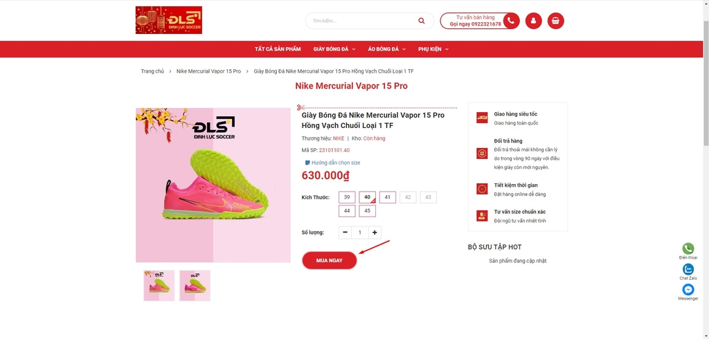 Sau khi click vào sản phẩm muốn mua, trang chi tiết sản phẩm sẽ hiện ra và việc của bạn chỉ cần chọn size giày của mình sau đó click MUA NGAY
