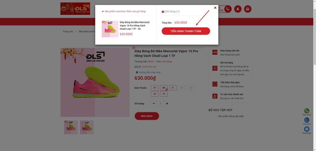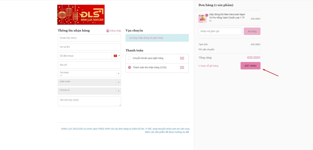 CÁCH 2: Đặt hàng trực tiếp trên website dinhlucsoccer.vn với các bước đơn giản sau:
